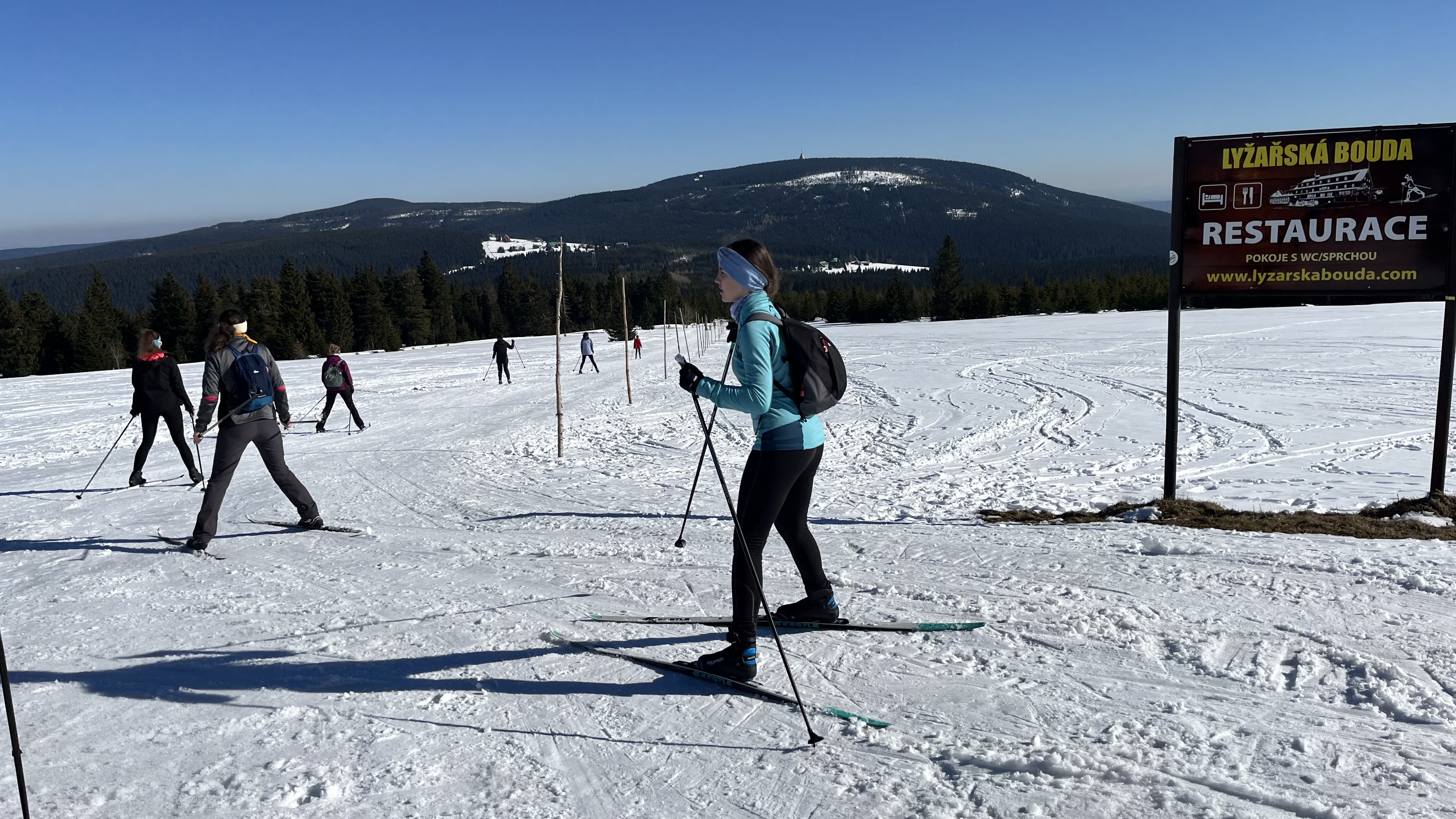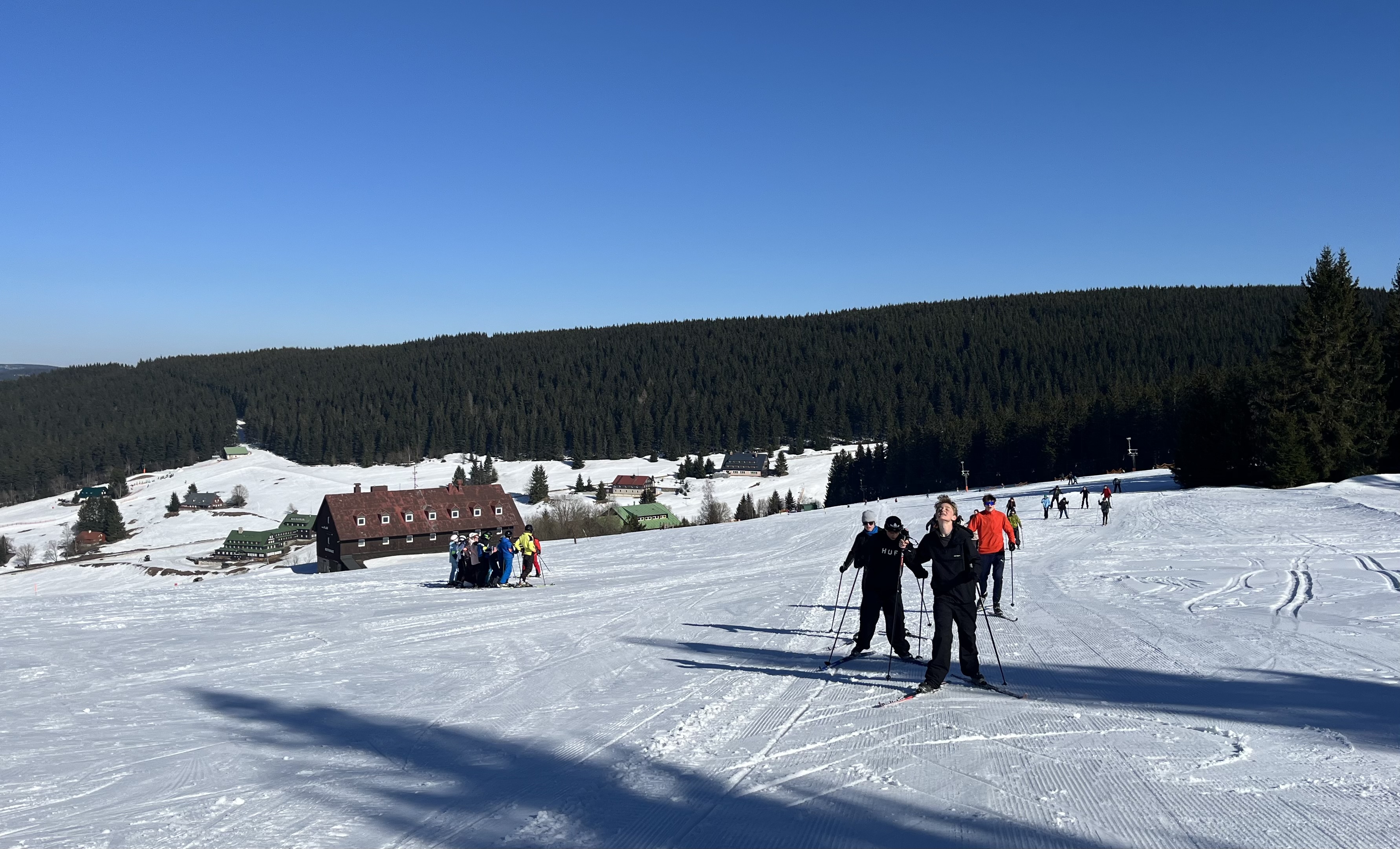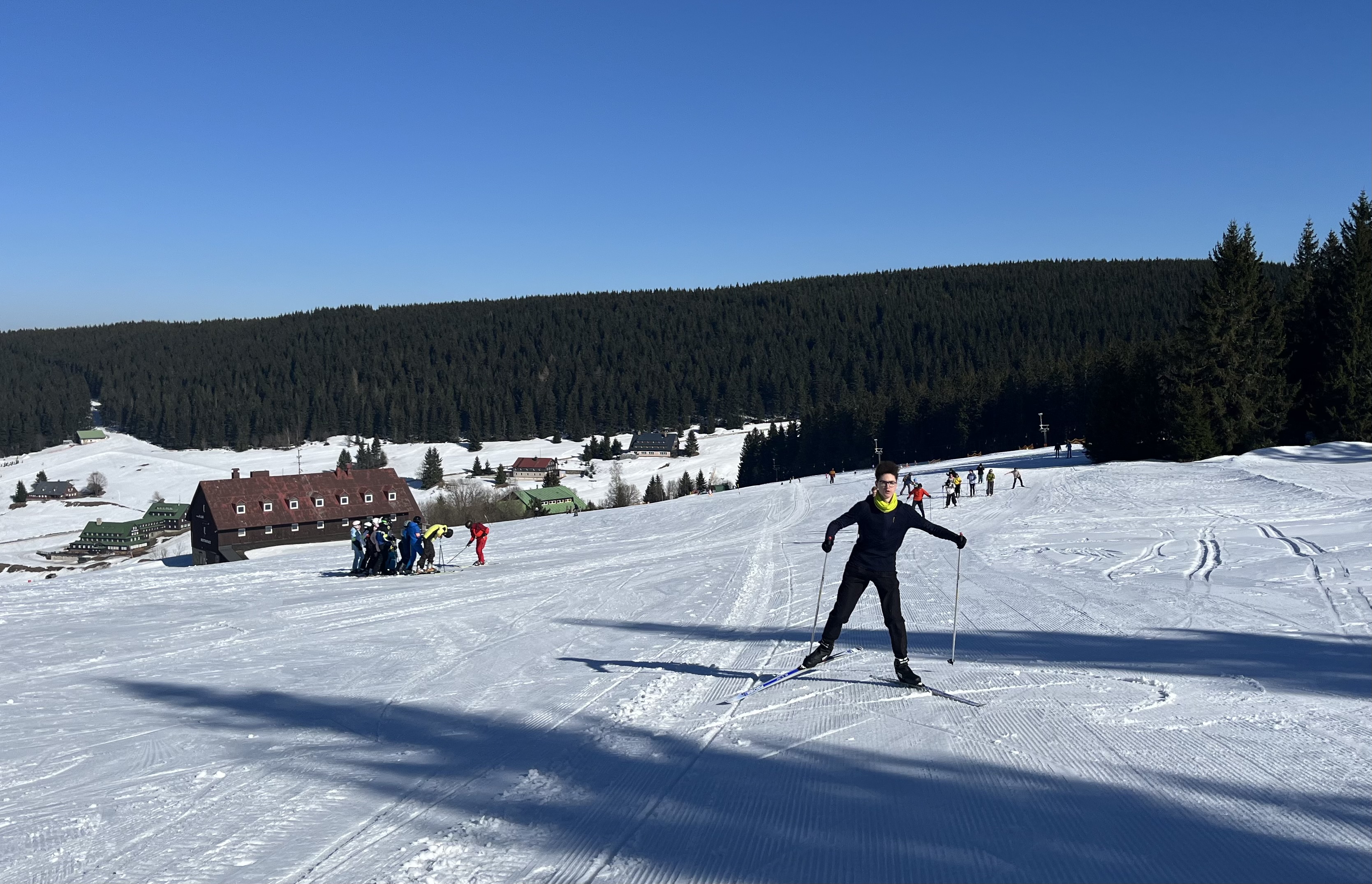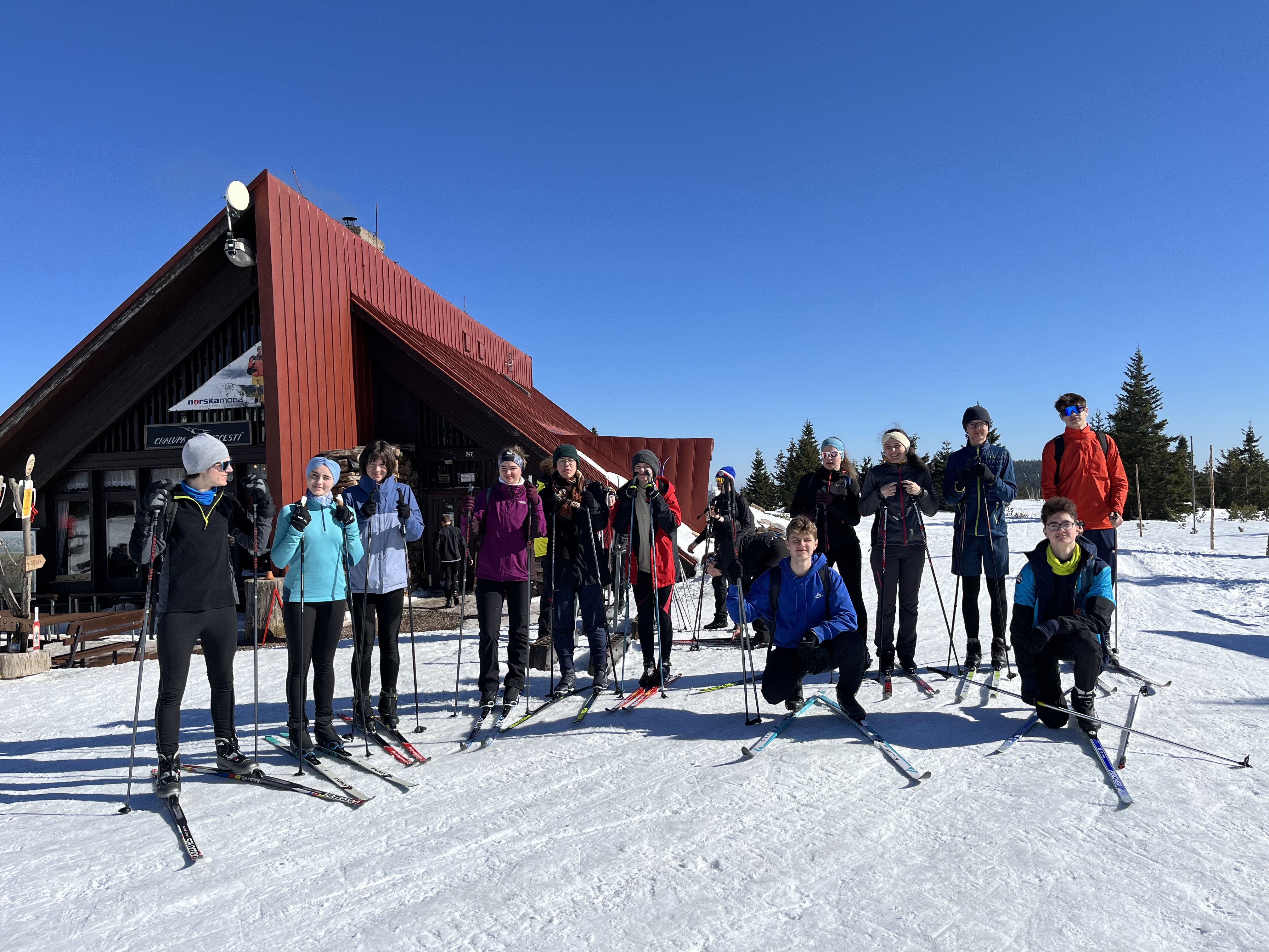 Jsme zpátky z kurzu, který proběhl za krásného počasí a na březen i velmi vydařených sněhových podmínek. Díky nim jsme si užili jak dopoledního lyžování (popřípadě “snowboardování”), tak i odpoledních běžek. A možná díky nim nikdo ani tak moc neprotestoval, když jsme vyrazili na celodenní výlet na běžkách přes Friesovy boudy na chatu Na Rozcestí a Výrovku. Dokonce jsme byli tak rychlí, že jsme stihli ještě to odpoledne cvičit divadelní představení s horskou tematikou (ta byla mimochodem také velmi povedená).